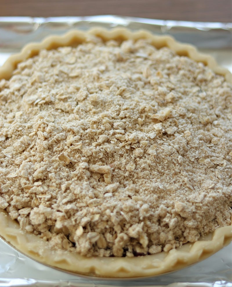 - Place the pie filling into the crust, then place the crumb topping on top.