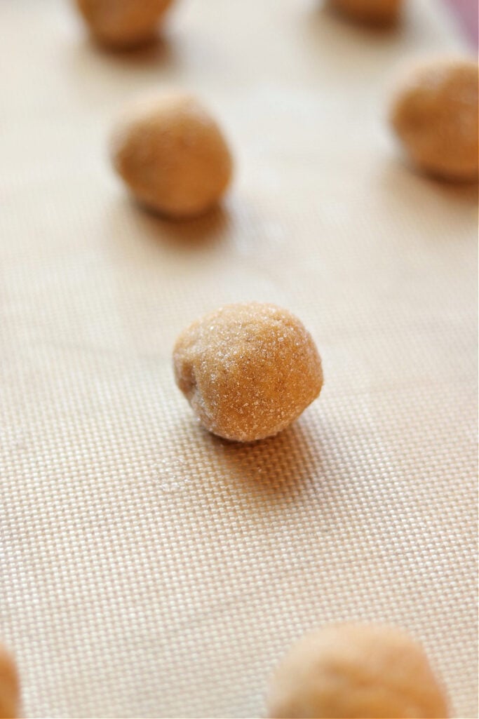 - Using a 1″ cookie scoop, roll the dough into balls. Next place the extra 1/8 cup of sugar into a small bowl. Then place the cookie ball into the sugar and mix it around until the dough ball is coated in sugar.