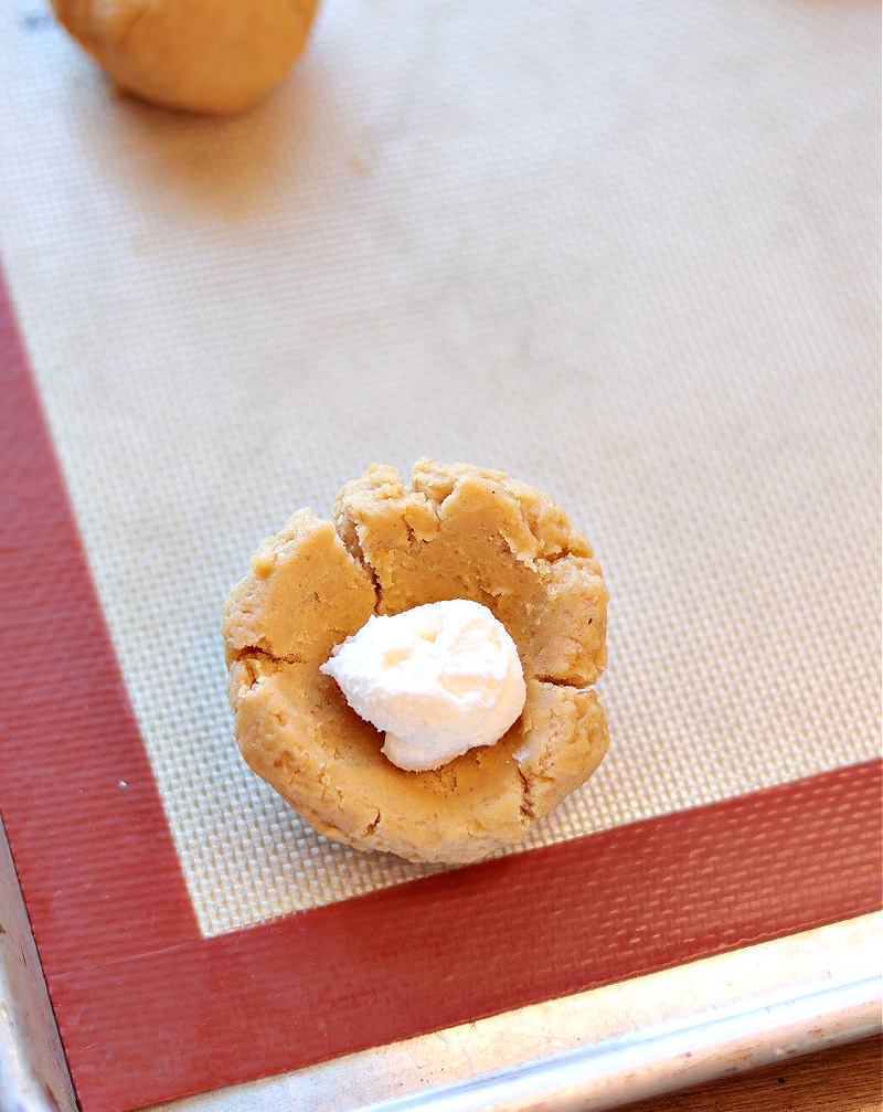 - Remove the dough balls from the fridge and the cream cheese mixture balls from the freezer. Press the cookie dough flat or make a small well in each where you can place the cheesecake ball. Roll the dough back into a ball, making sure to completely cover all of the cheesecake mixture, if possible. If not, place the part that shows on the bottom of the cookie.