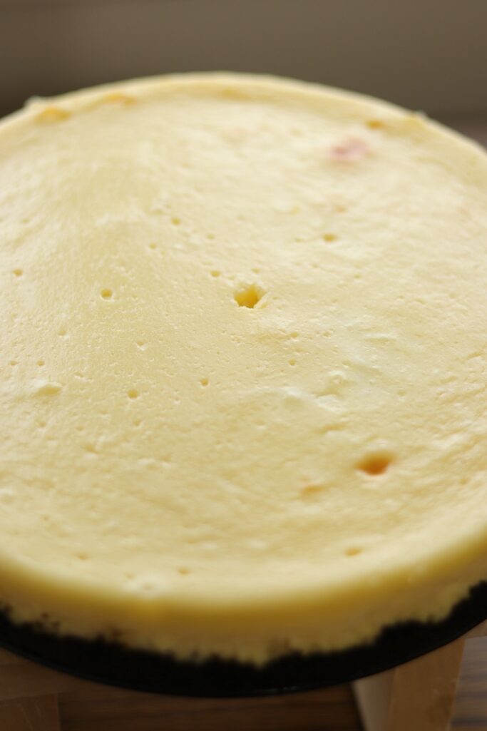 - Remove the cheesecake from the oven, and remove the foil. Then use a knife and go along the outside of the cheesecake so that it won’t stick. Allow the cheesecake to sit for about 30 minutes, then remove the outer ring of the pan. Place the cheesecake in the refrigerator for 3 – 4 hours and allow it to cool.